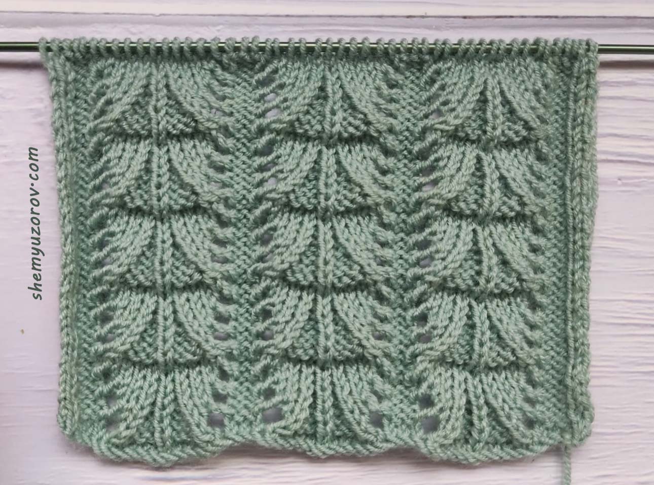 1-й ряд: кром. п., * 3 изн. п., накид, 2 п. вместе лиц. протяжкой, 3 изн. п., 1 лиц. п., 3 изн. п., 2 п. вместе лиц., накид *; повторять от * до *, 3 изн. п., кром. п.
